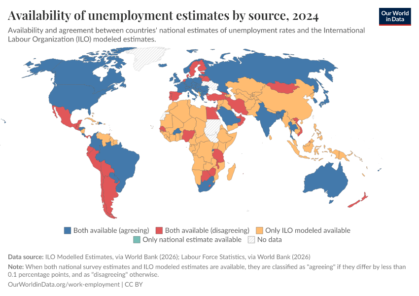 The map here gives you an overview of the coverage of the ILO’s unemployment rate estimates across countries and time. It distinguishes between years where both national survey values and modeled estimates exist (and whether these estimates agree), and those where only one or neither is available.18