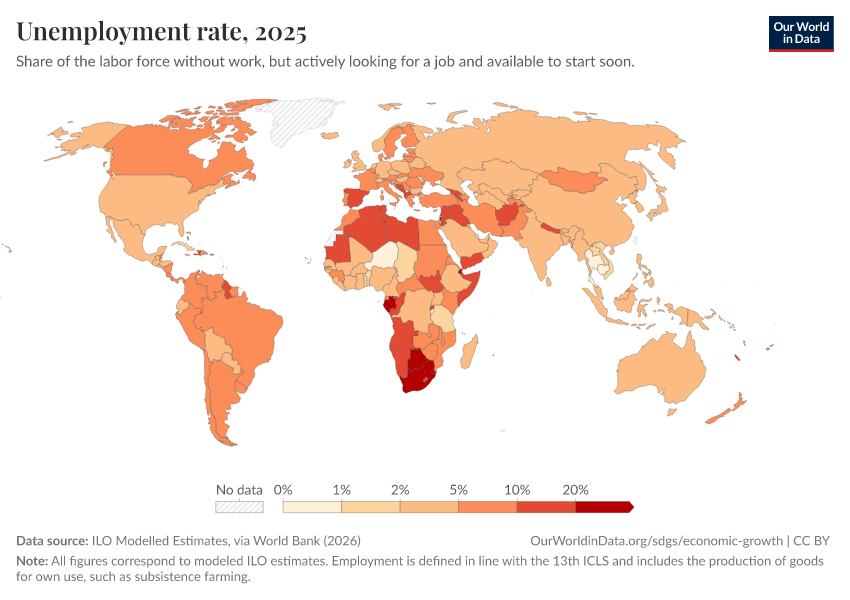 This is something that often surprises people: some poor countries have similar or even lower unemployment rates than rich countries. For example, Burkina Faso and Australia have roughly the same unemployment rate (around 3.5% and 4 % in 2025).